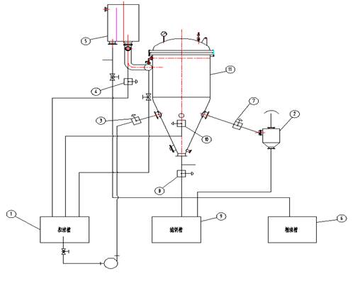 當(dāng)濾餅的厚度達到要求時,關(guān)閉進料閥③,打開卸壓閥⑦,過濾機內(nèi)部壓力降低,蓄液槽⑤中的濾液返流通過濾袋,卸掉濾餅,濾餅脫落于懸浮液中,向筒體的錐底部沉淀。打開卸泥閥⑧,排出循環(huán)產(chǎn)生的濾餅。